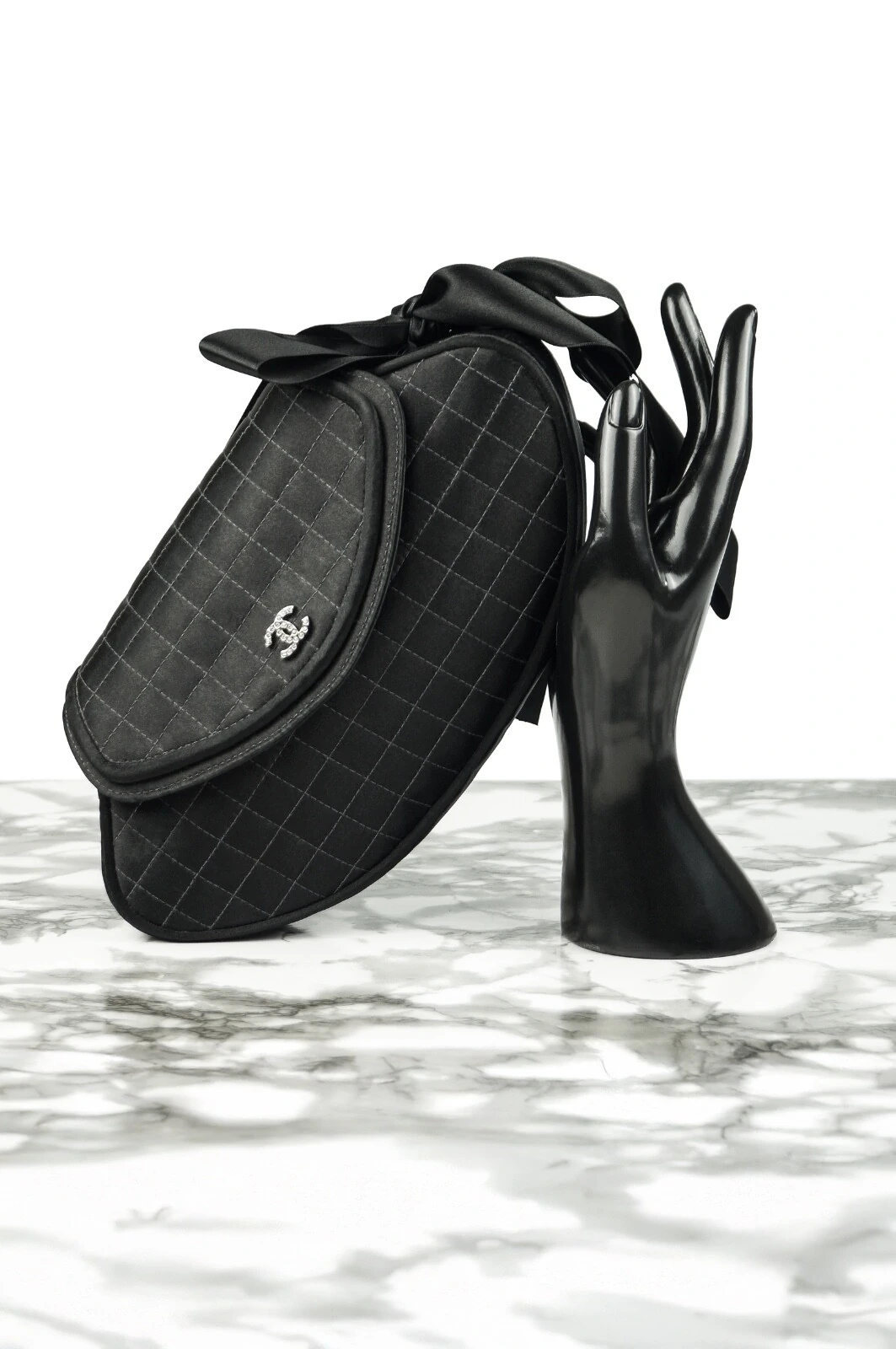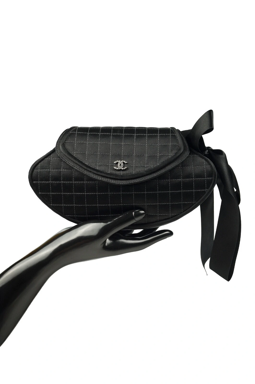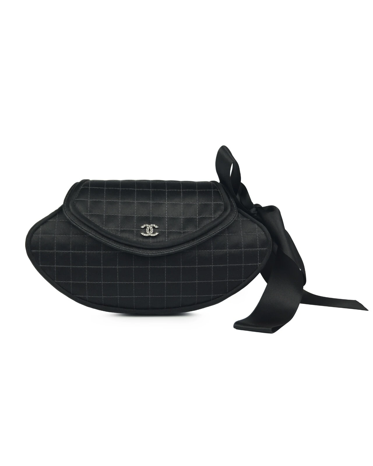 Clutch Chanel em cetim preta com acabamento matelassê, detalhe em laço lateral e fecho com o icônico logo CC.
