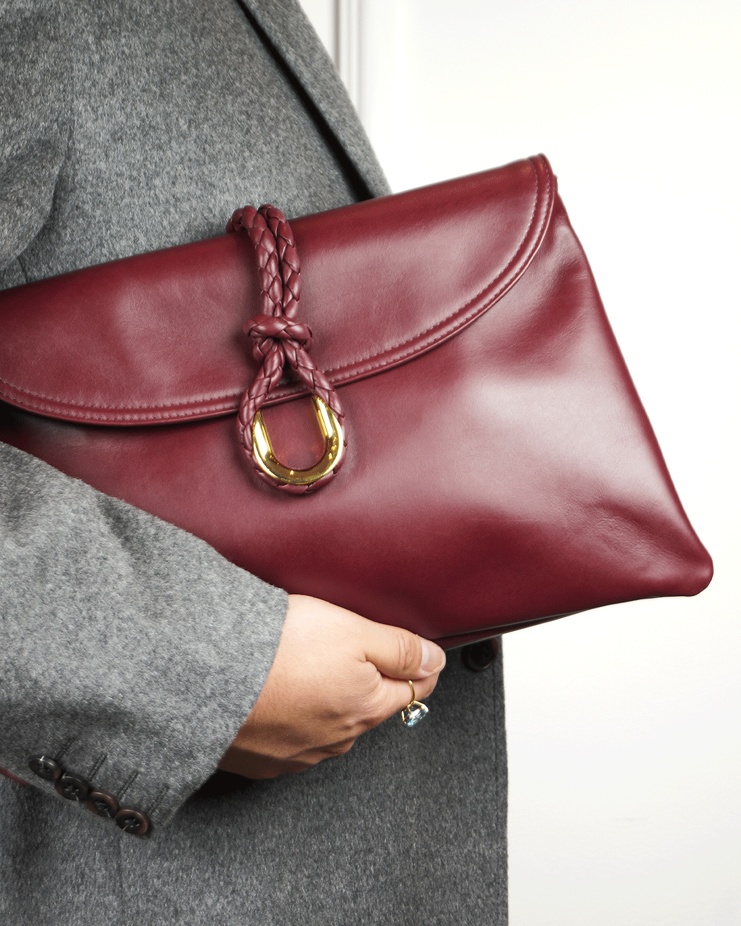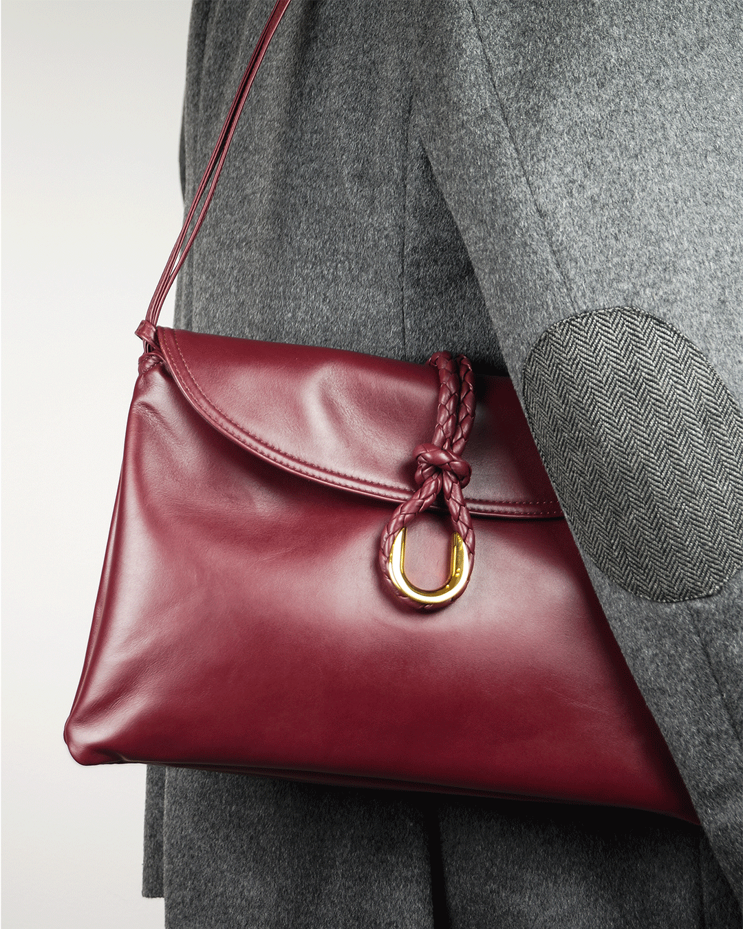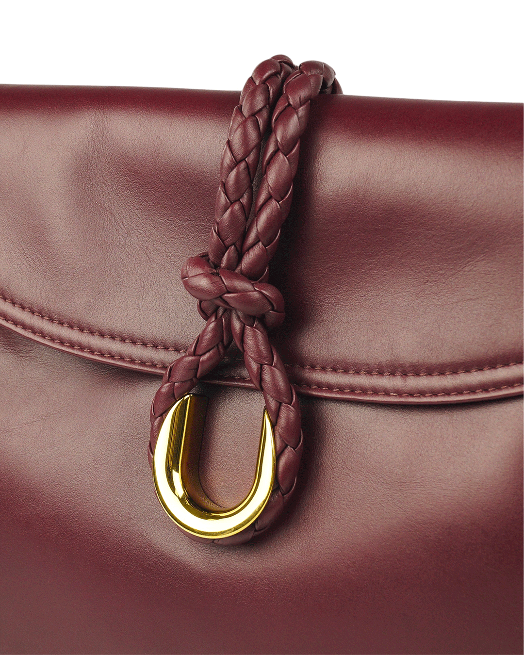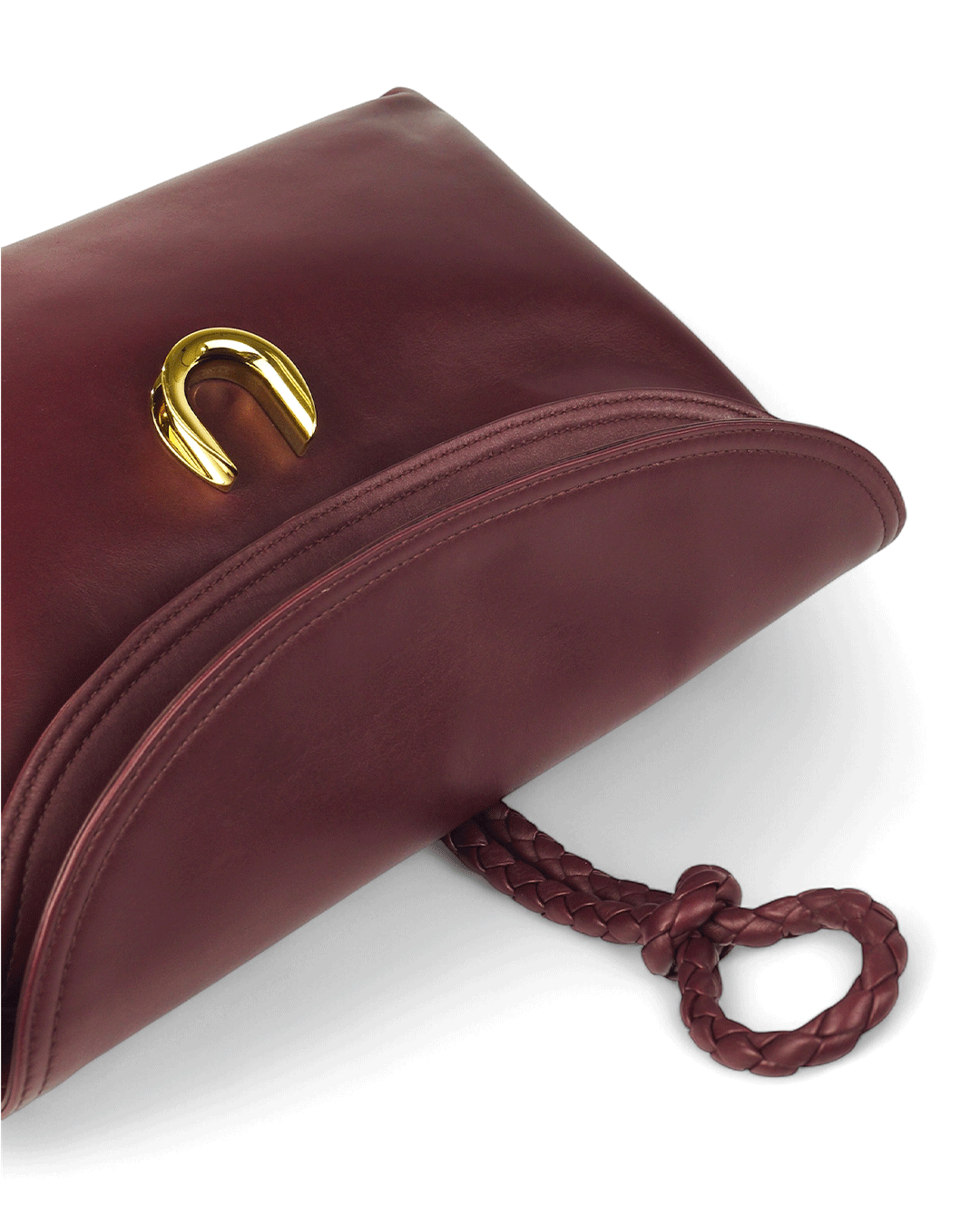 Elegância atemporal em couro de bezerro liso na sofisticada tonalidade Barolo. Fecho em cordão trançado de couro com detalhe metálico dourado em formato de anel. Design minimalista com alça ajustável para uso no ombro ou tiracolo. Uma peça icônica da Bottega Veneta que une sofisticação e praticidade.