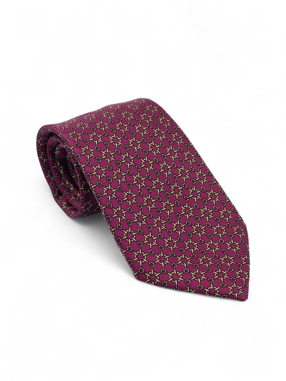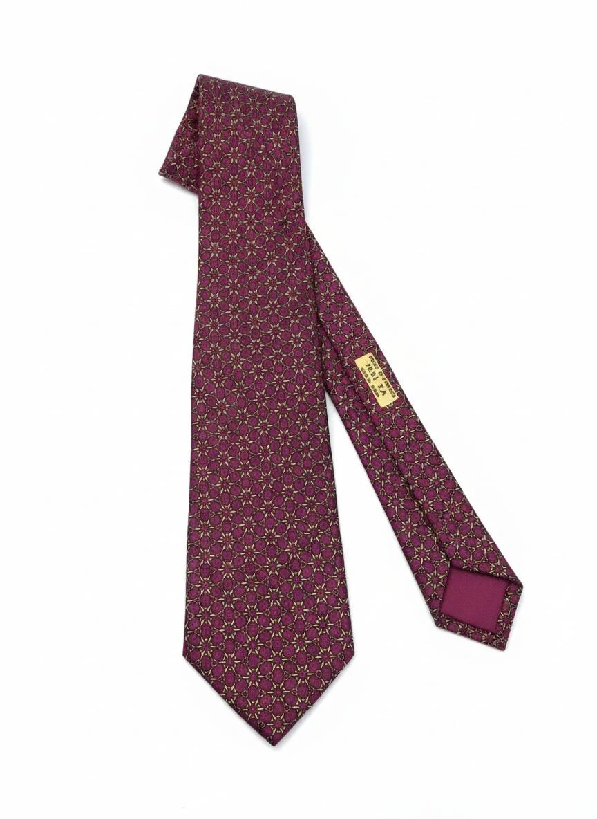 Em seda pura,(100%) este modelo Hermès combina o tom amarante profundo com um padrão geométrico refinado, evocando o equilíbrio entre arte e tradição. Feita na França em heavy silk, tem caimento impecável e brilho sutil — um toque de sofisticação discreta para qualquer ocasião.