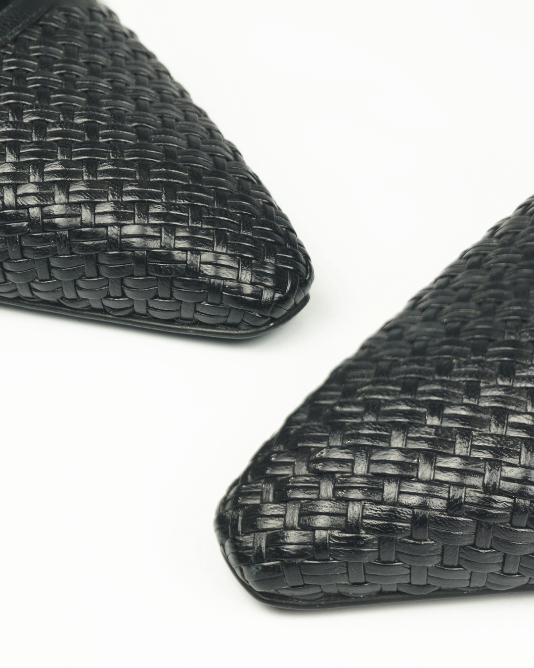 A trama Intrecciato, técnica artesanal exclusiva da marca que tece tiras de couro de bezerro com precisão quase escultórica, cria uma superfície textural rica e inconfundível. Cada par é uma expressão de volume e movimento, refletindo a herança veneziana da casa, onde o couro deixa de ser apenas material para se tornar linguagem estética.