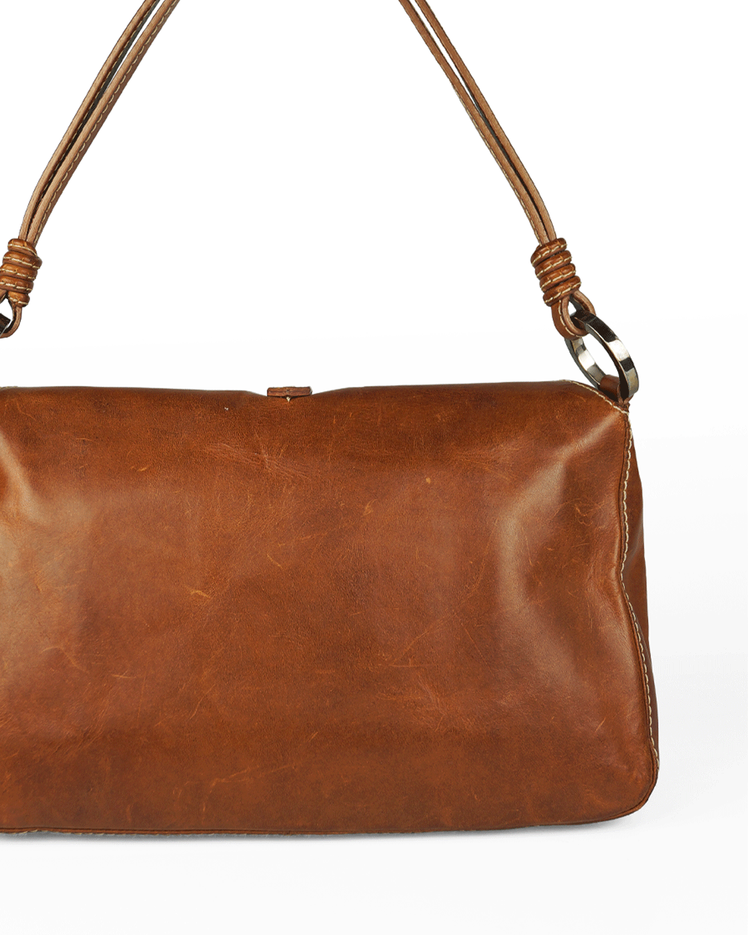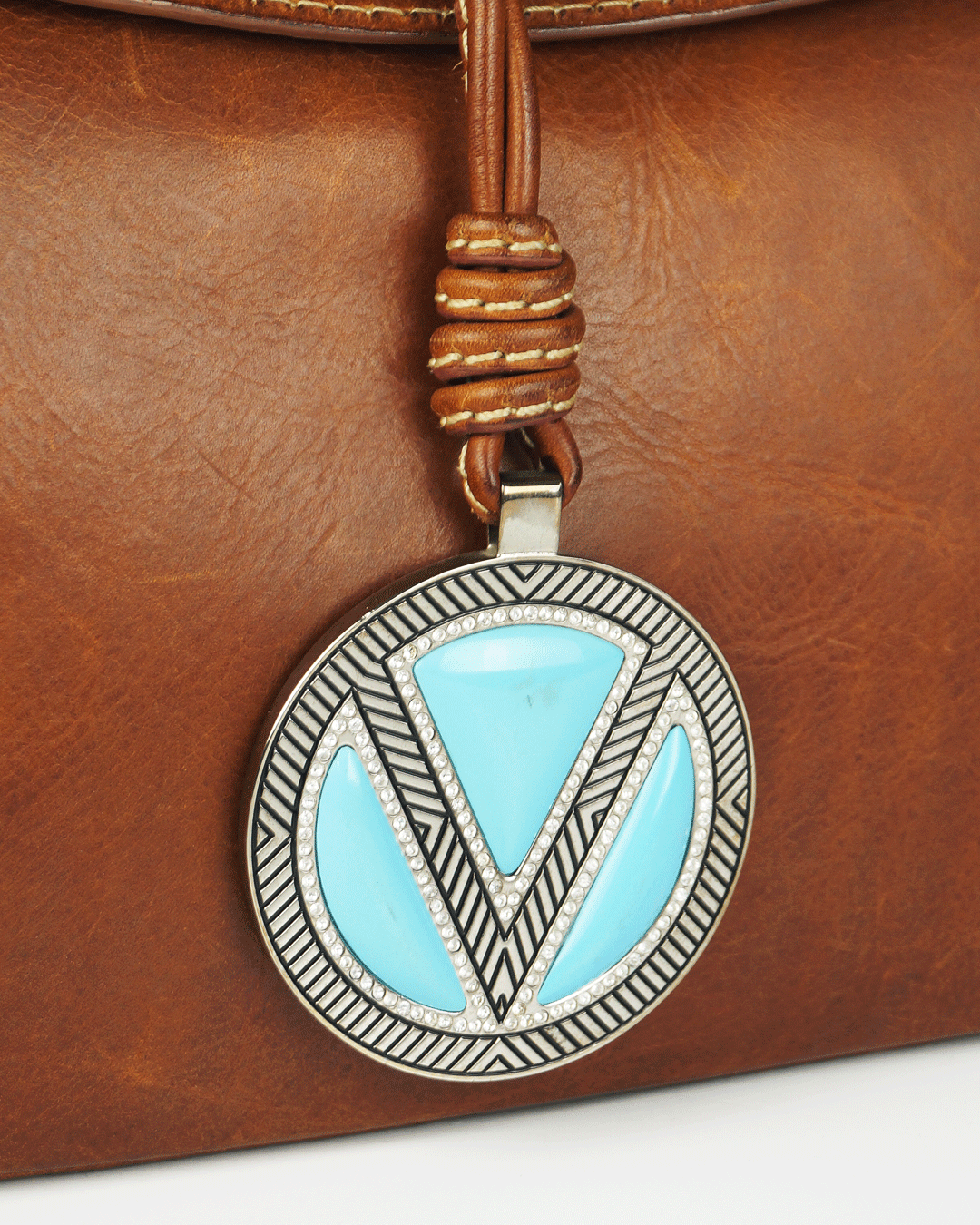 Shoulder bag Valentino Garavani em couro cru caramelo com acabamento V Logo Signature e medalhão de turquesa. Um modelo de estética clássica com um toque vibrante.
